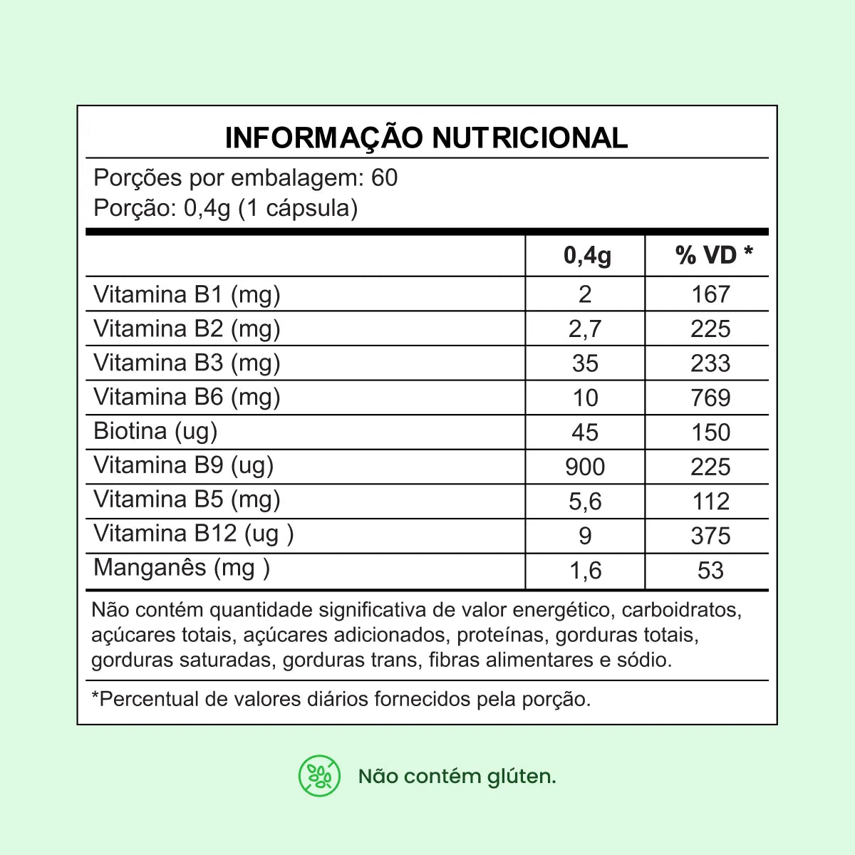 Ingredientes: Niacina (Vitamina B3), Cloridrato de piridoxina (Vitamina B6), Bisglicinato de manganês (Manganês), Pantotenato de Cálcio (Vitamina B5), Riboflavina (Vitamina B2), Cloridrato de tiamina (Vitamina B1), Ácido Fólico (Vitamina B9), D-Biotina, Cianocobalamina (Vitamina B12), estabilizante celulose microcristalina e antiumectantes estearato de magnésio e dióxido de silício. Composição da cápsula: Água, Gelatina e Corante inorgânico dióxido de titânio.