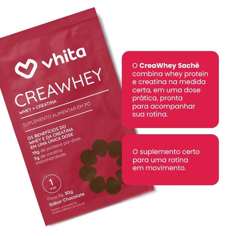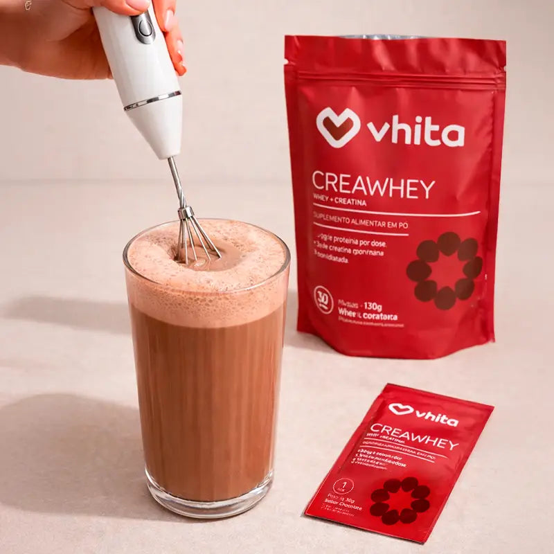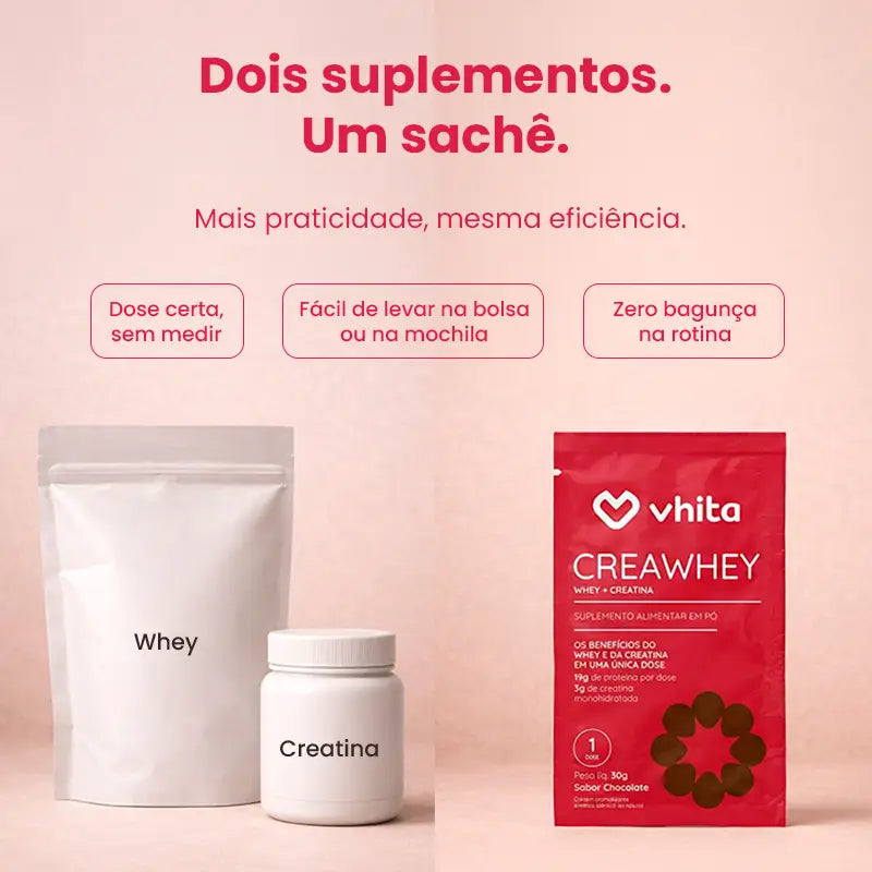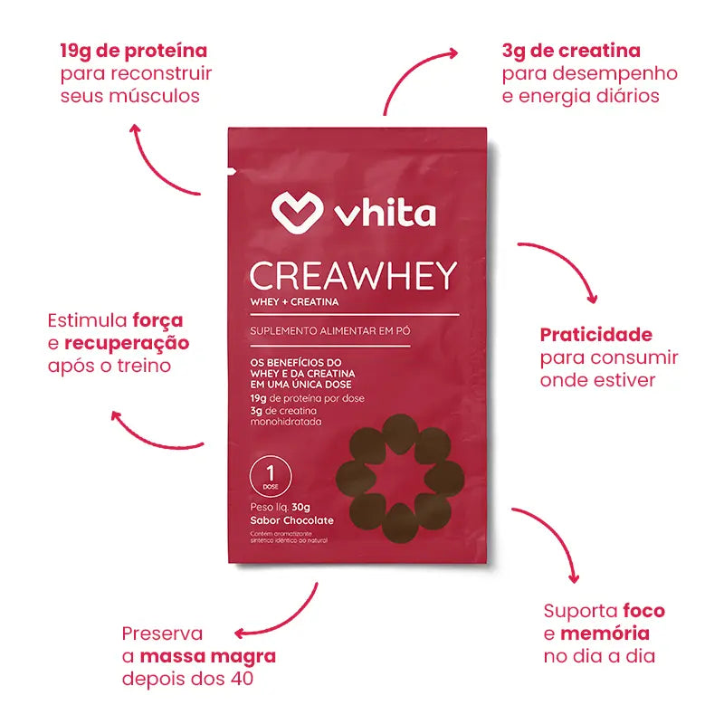 O CreaWhey da Vhita combina Whey Protein e Creatina em uma fórmula ideal para quem busca mais força, recuperação e preservação da massa muscular de maneira prática e fácil.