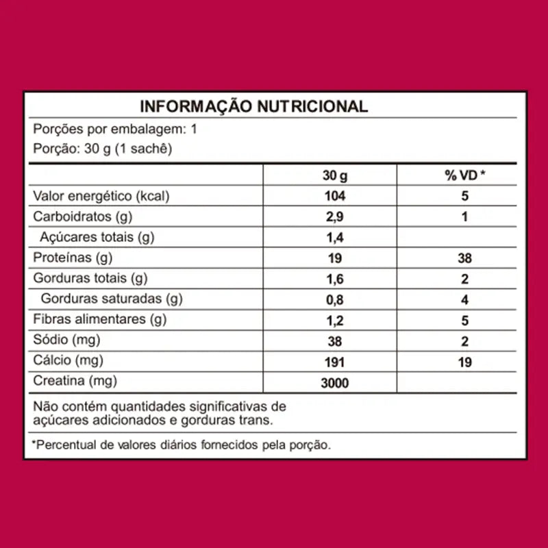 19g de Proteína: Proveniente de whey protein concentrado, amplamente reconhecido por sua alta qualidade nutricional e rápida digestão, ideal para estimular a síntese proteica muscular.