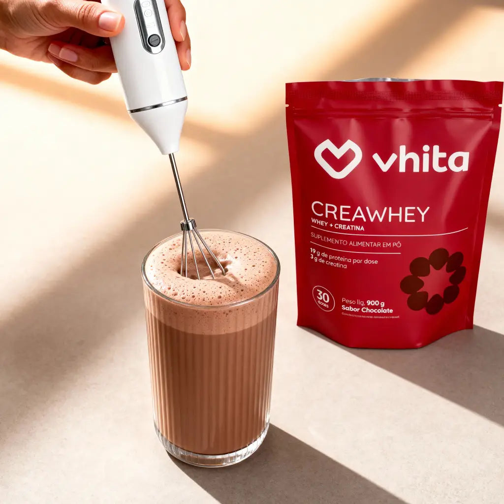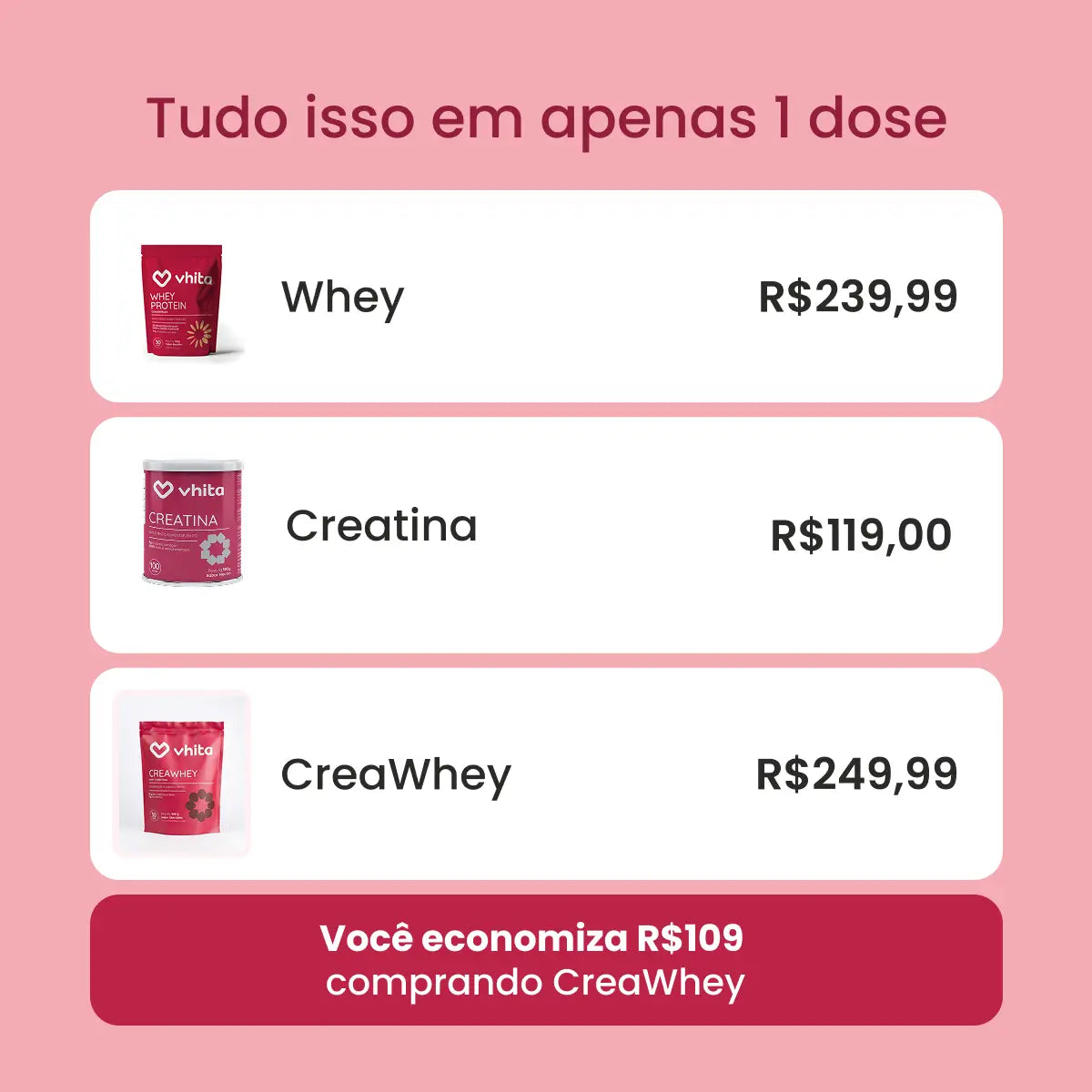 O CreaWhey da Vhita combina Whey Protein e Creatina em uma fórmula ideal para quem busca mais força, recuperação e preservação da massa muscular de maneira prática e fácil.