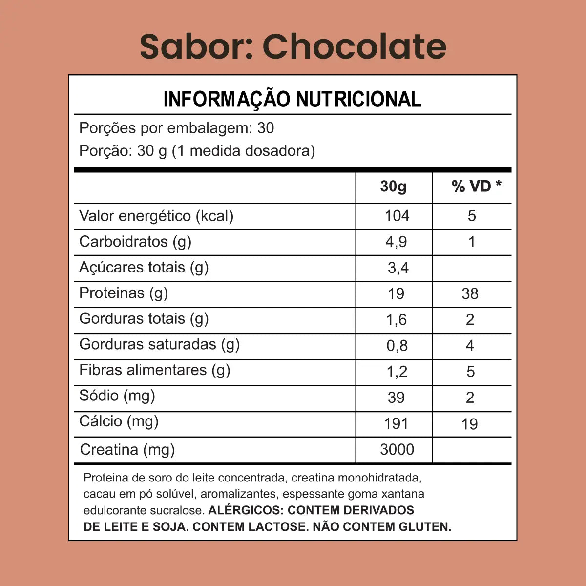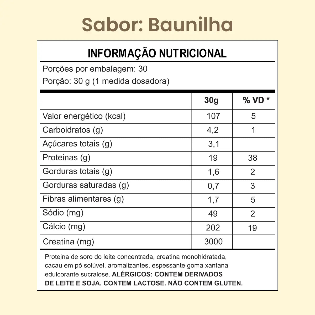 19g de Proteína: Proveniente de whey protein concentrado, amplamente reconhecido por sua alta qualidade nutricional e rápida digestão, ideal para estimular a síntese proteica muscular. 3g de Creatina: Em conformidade com a dose clínica utilizada para melhora na força muscular, desempenho físico e suporte à recuperação. Outros Ingredientes: