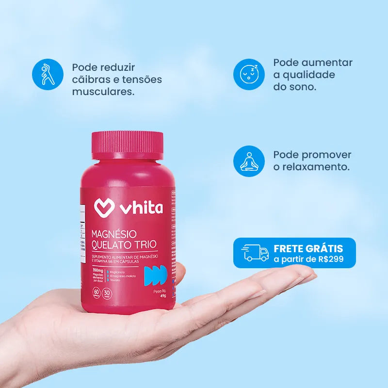 Para uma solução completa, o Magnésio Quelato Trio da Vhita combina Dimalato, Bisglicinato e Taurato, potencializando os benefícios para sua saúde.
