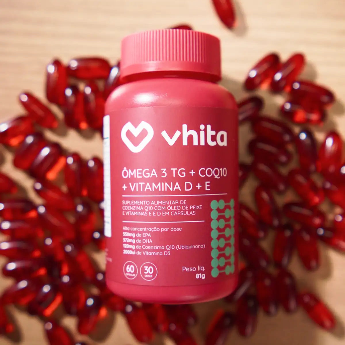 Ômega 3 e Coenzima Q10 auxiliam na saúde do coração e produção de energia, enquanto a Vitamina D fortalece os ossos e a imunidade.